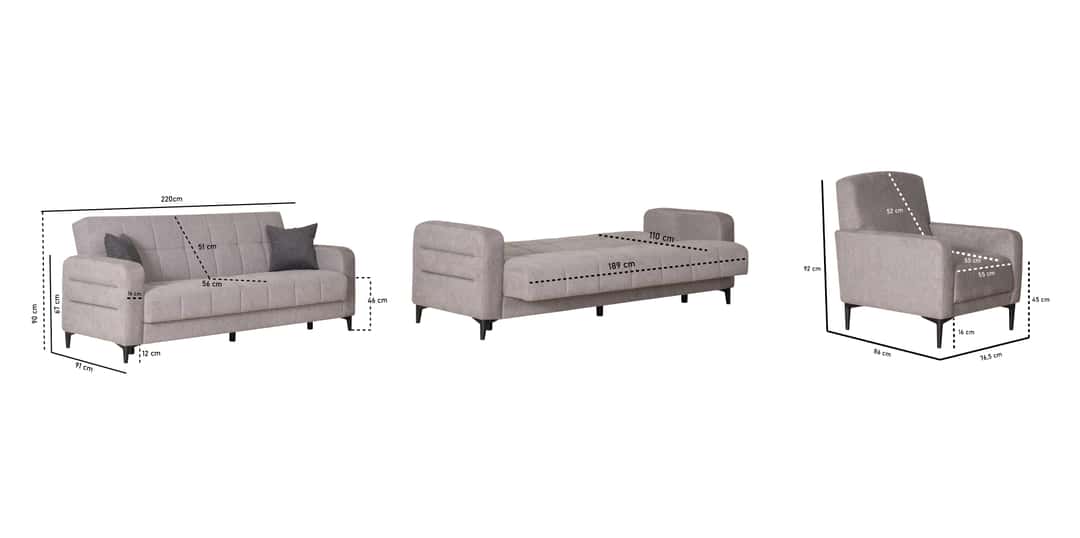 Yataklı koltuk takımı arayanlar için ideal bir seçenek sunar. OturmaOdasını dekore etmek için modern evdekorasyonu trend rengi gri tonlarında kumaşı siyahayaklar ile bütünleşti.